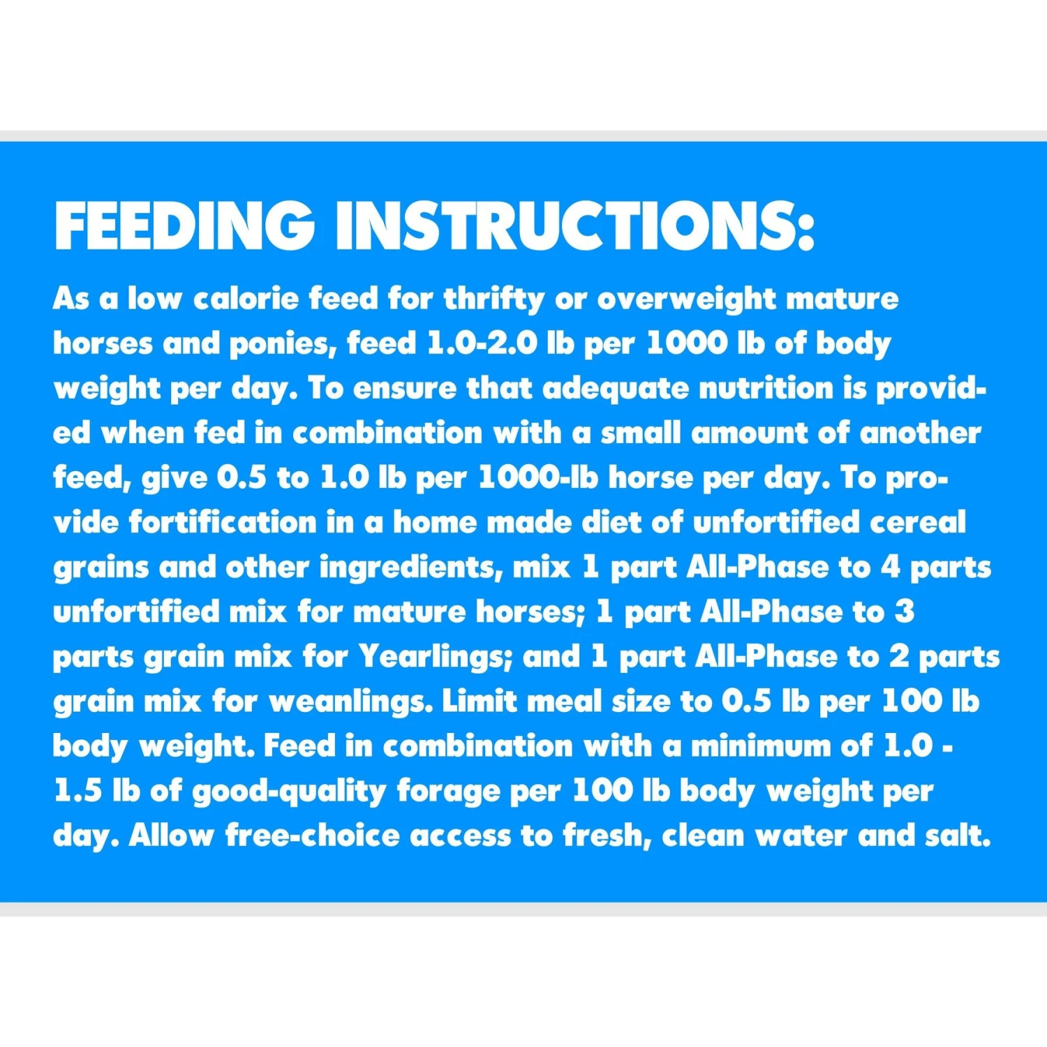 - Can be mixed with cereal grains or other feeds to balance nutrient levels when you’re feeding less fortified feed at less than the recommended levels.
