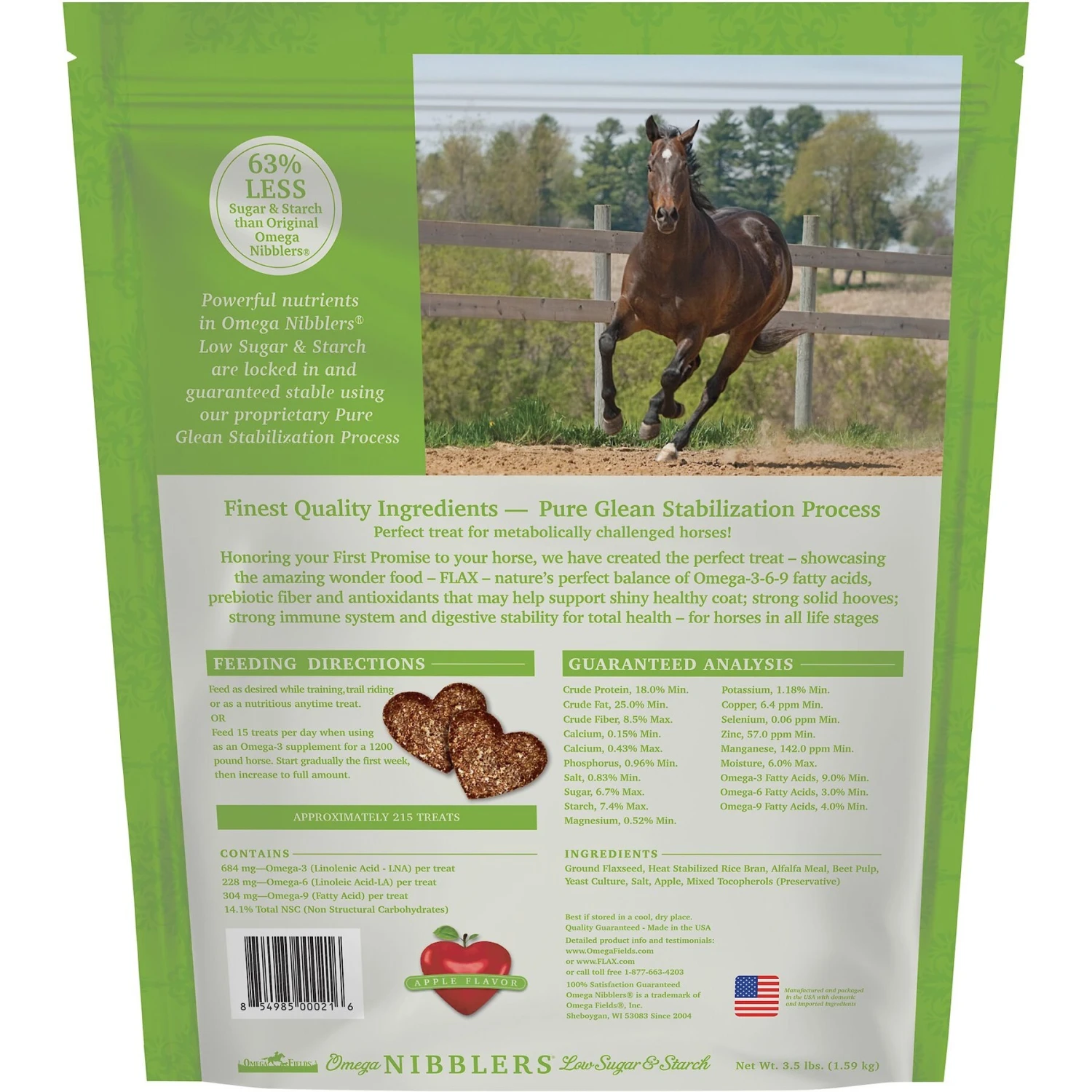 - Contains Omega-3 fatty acids to promote a soft and shiny coat, healthy skin and strong hooves.