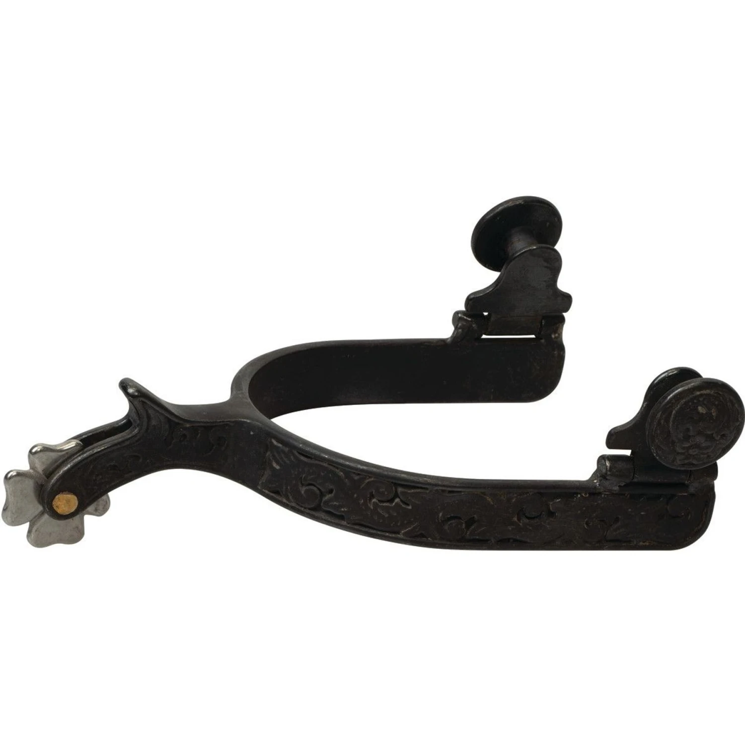 - Black steel spurs with engraved details.